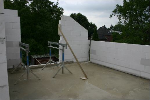 Nachdem wir jetzt eine Weile terminbedingt die Baustelle nicht besuchen konnten, gibt es viel Neues zu sehen: die Erdgeschoss-Decke ist gegossen worden (obwohl in der Baubeschreibung von Fertigelementteilen die Rede ist) und eine Treppe haben wir jetzt auch -- ebenfalls massiv gegossen.