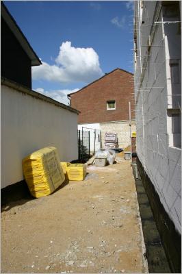 hier wird demnächst eine Garage ihr neues Zuhause finden, Anlieferung per Autokran über das Nachbarhaus hinweg.