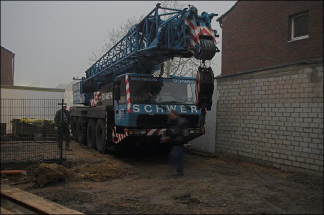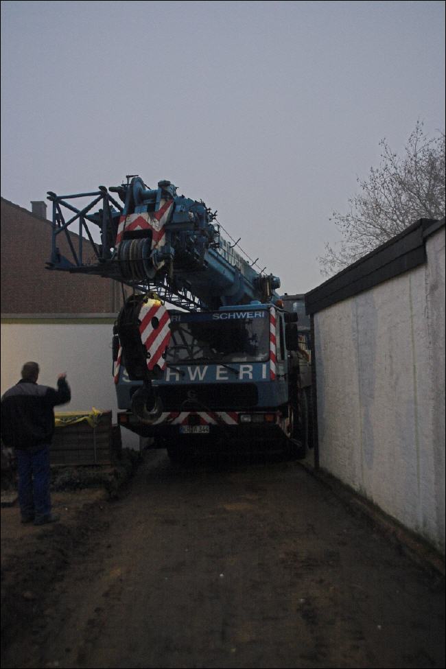Zunächst war es etwas schwierig, den 60-Tonnen-Koloss durch die schmale Einfahrt zu bugsieren... |