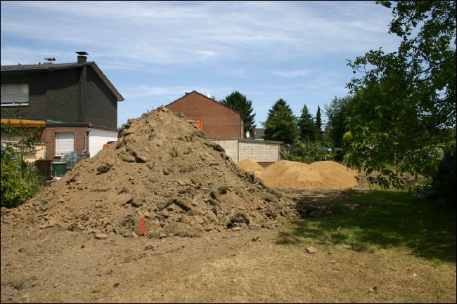 Der Bagger rückt an und entfernt zunächst alle auf dem Grundstück befindlichen Wurzeln. Im Vorfeld haben wir etwa 20 Bäume fällen lassen müssen, die direkt oder indirekt den Bau behindert hätten. Im Nachhinein haben wir und unsere Nachbarn Glück gehabt: einige Bäume erwiesen sich also so morsch, dass sie bei einem der nächsten Stüme umgekippt wären. |