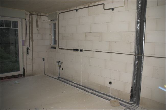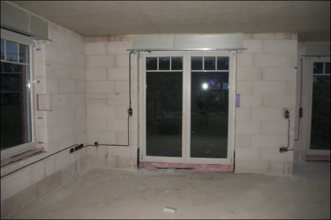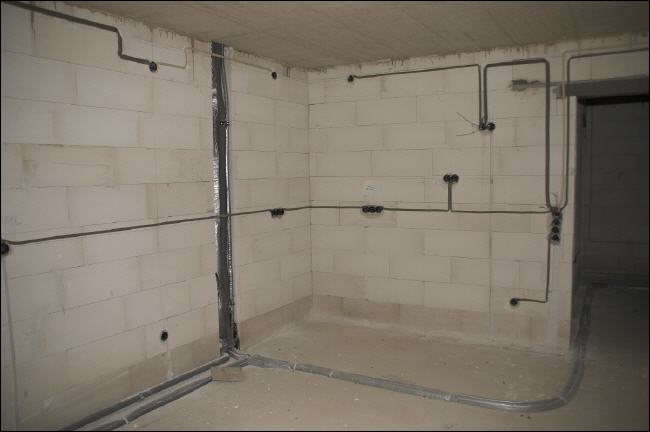 Die Elektriker haben begonnen die ersten Löcher für Schalter und Steckdosen ins Mauerwerk zu bohren. Auch wurden die ersten Kabel verlegt. |