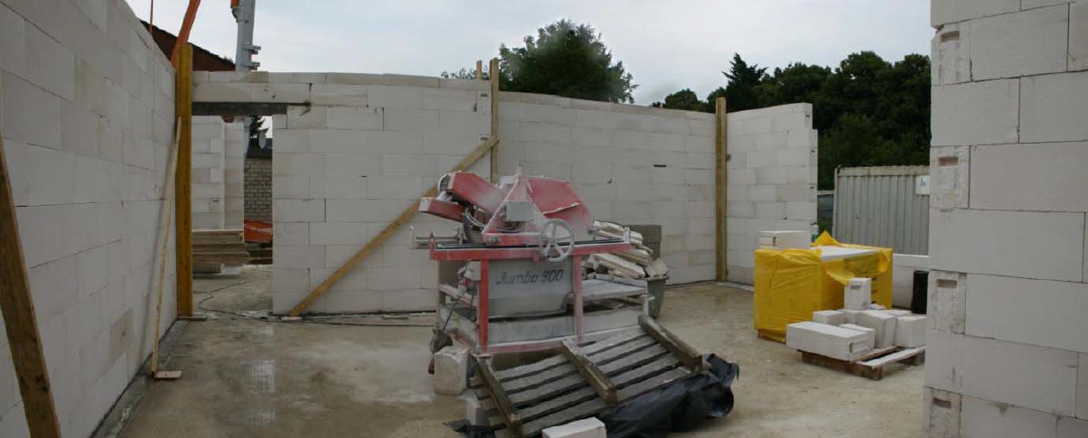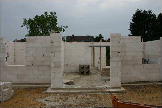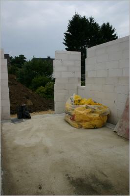 Da ist man mal einen Tag nicht auf der Baustelle, da mauern die Arbeiter glatt das ganze Erdgeschoss! Wow! Toller Anblick -- wir standen zum ersten Mal im Wohnzimmer und konnten aus dem Fenster schauen.