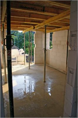 Die Stützbretter und -pfeiler für die Erdgeschossdecke sind montiert worden. Beide Kamine stehen, allerdings fehlt noch immer die Wand zwischen Speisekammer und Gäste-WC. Ein Fehler oder System?