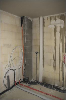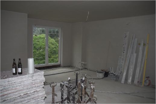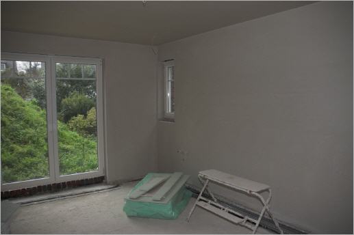 Die Elektriker haben mittlerweile ihre Arbeiten beendet und das Feld für die Verputzer geräumt. Nach 2 Tagen Arbeit sind alle Räume bis auf HWR, Speisekammer, Bad und Flur im EG schön ordentlich verputzt.