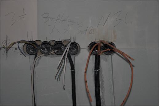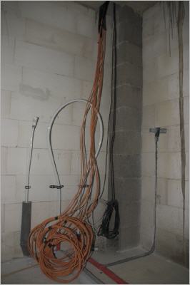 In den letzten beiden Tagen wurden hauptsächlich im Obergeschoss gearbeitet. Fast alle Räume -- bis auf das Bad -- wurden mit Elektro, SAT- und Netzwerkleitungen versorgt. Das alles endet im Hauswirtschaftsraum, wo jetzt schon ein stattlicher Kabelstrang von der Decke baumelt.
