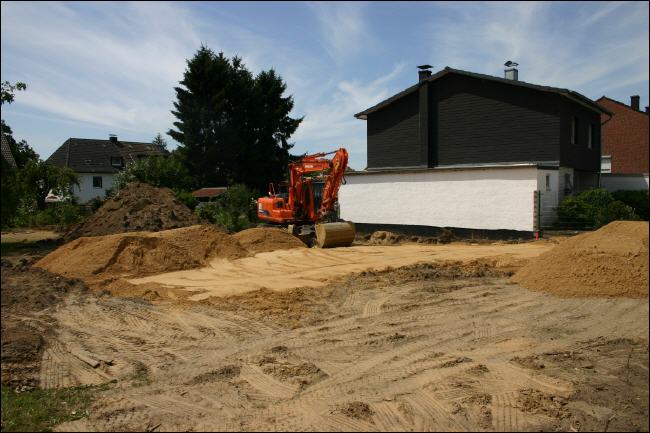 Der Bagger rückt an und entfernt zunächst alle auf dem Grundstück befindlichen Wurzeln. Im Vorfeld haben wir etwa 20 Bäume fällen lassen müssen, die direkt oder indirekt den Bau behindert hätten. Im Nachhinein haben wir und unsere Nachbarn Glück gehabt: einige Bäume erwiesen sich also so morsch, dass sie bei einem der nächsten Stüme umgekippt wären. |
