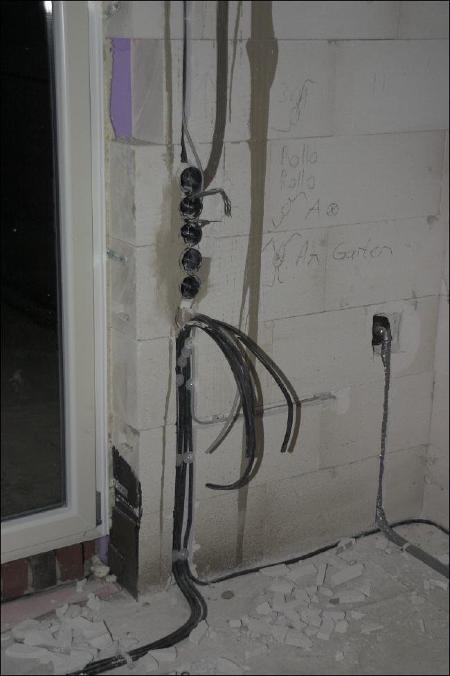 Die Elektroarbeiten gehen zügig voran. Morgen müssen die Arbeiten beendet werden, denn der Verputzer steht bereits vor der Tür. Jetzt geht es Schlag auf Schlag! Das Haus gleicht derweil immer mehr einem Umspannwerk... |